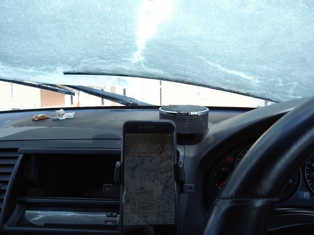 ダッシュボードに置かないだけでこんなに見晴らしが良くなる。それにハンドルの近く、電子機器の近くにあって統一感もいい。