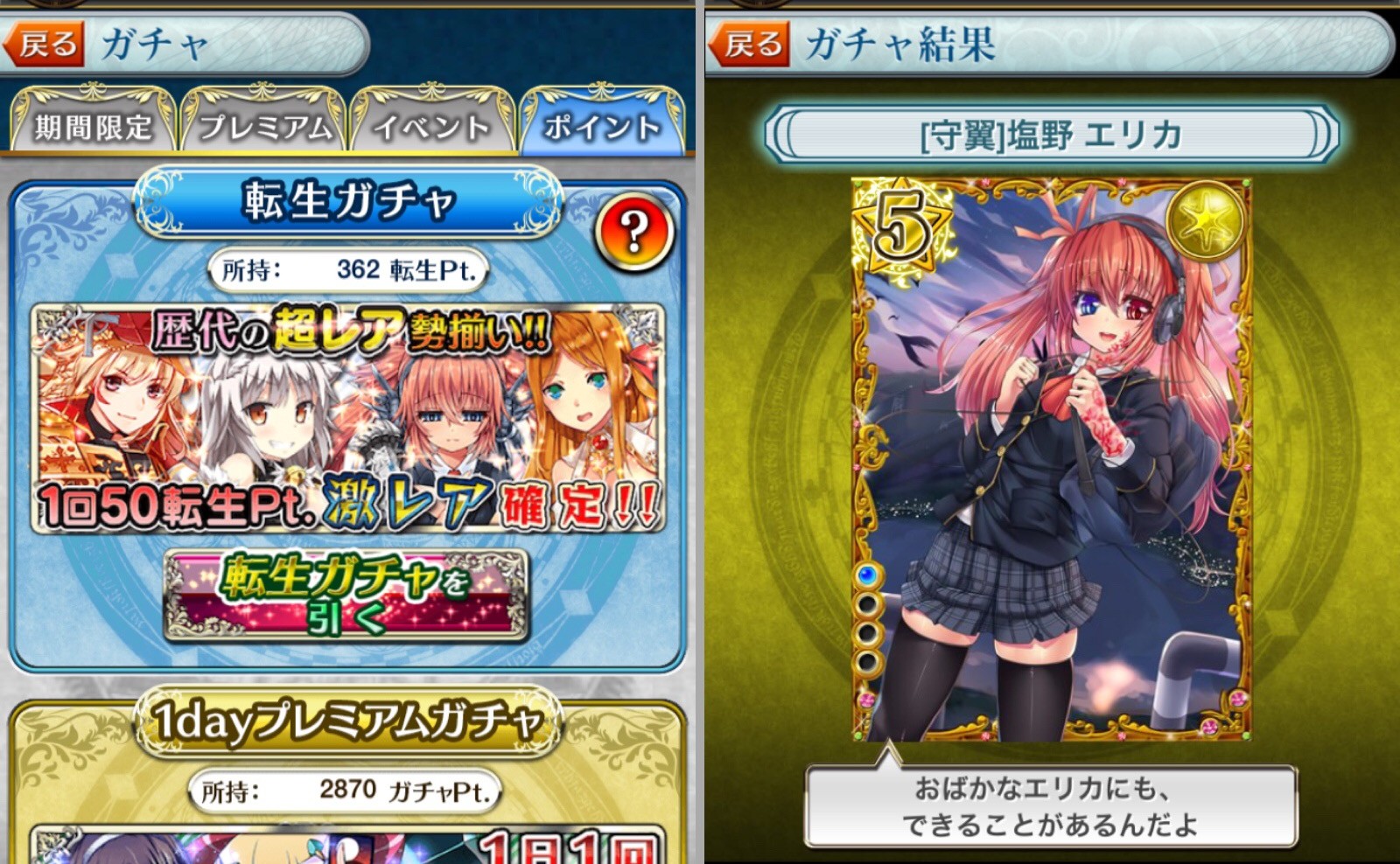 1枚は初の★5エリカ!全体攻撃はデュエルで役に立つし、今まで★3の全体攻撃を使っていたのでようやく入換えができそうです。たまには転生ガチャでもいいことがあるようです。